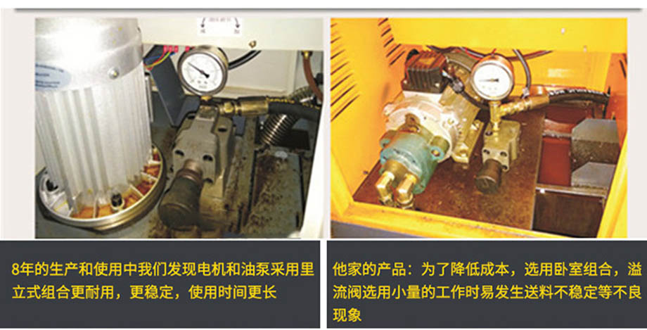 超過10年的生產(chǎn)和使用中我們發(fā)現(xiàn)電機和油泵采用里立式組合更耐用,更穩(wěn)定,使用時間更長。有個別廠商為了降低成本,選用臥式組合,溢流閥選用小量的工作時易發(fā)生送料不穩(wěn)定等不良現(xiàn)象。